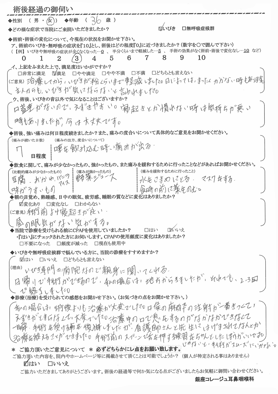 (ご意見) 治療してから、いびきが半分くらいまで軽減しました。日によっては、全くかかない時もあります。主人からも、いびきが気にならないと言われました。