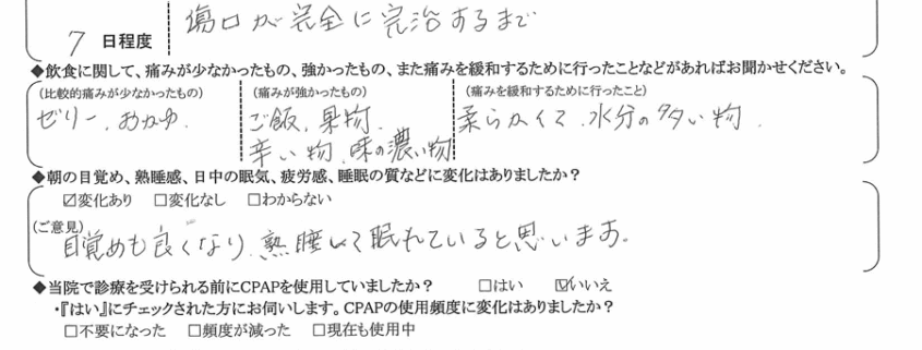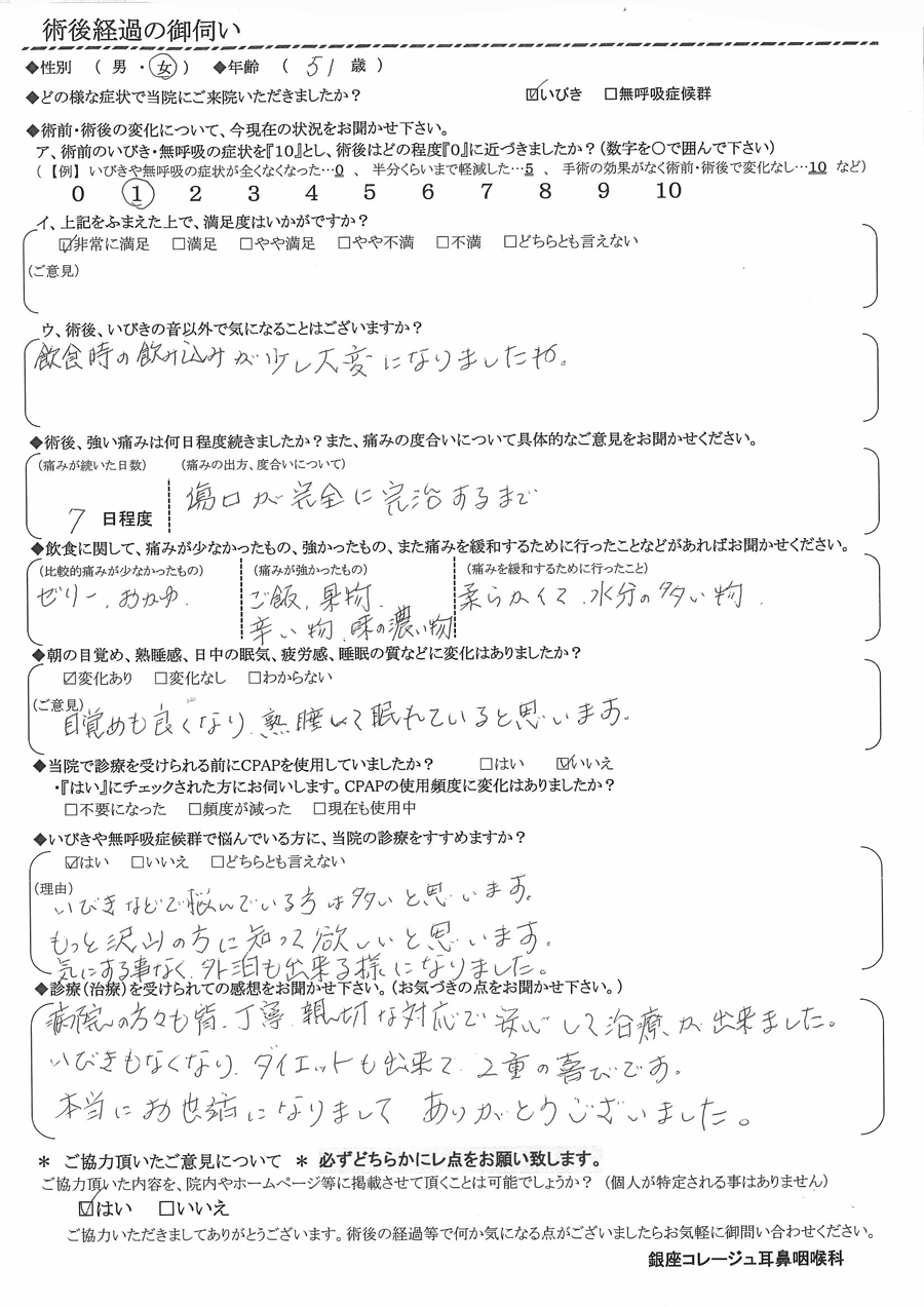 A: 病院の方々も皆、丁寧親切な対応で安心して治療が出来ました。イビキもなくなり、ダイエットも出来て、2重の喜びです。本当にお世話なりまして、ありがとうございました。