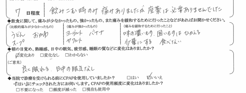 A:(痛みを緩和するために行ったこと) 味の濃い物、固い物は控える、少量にする、食べない