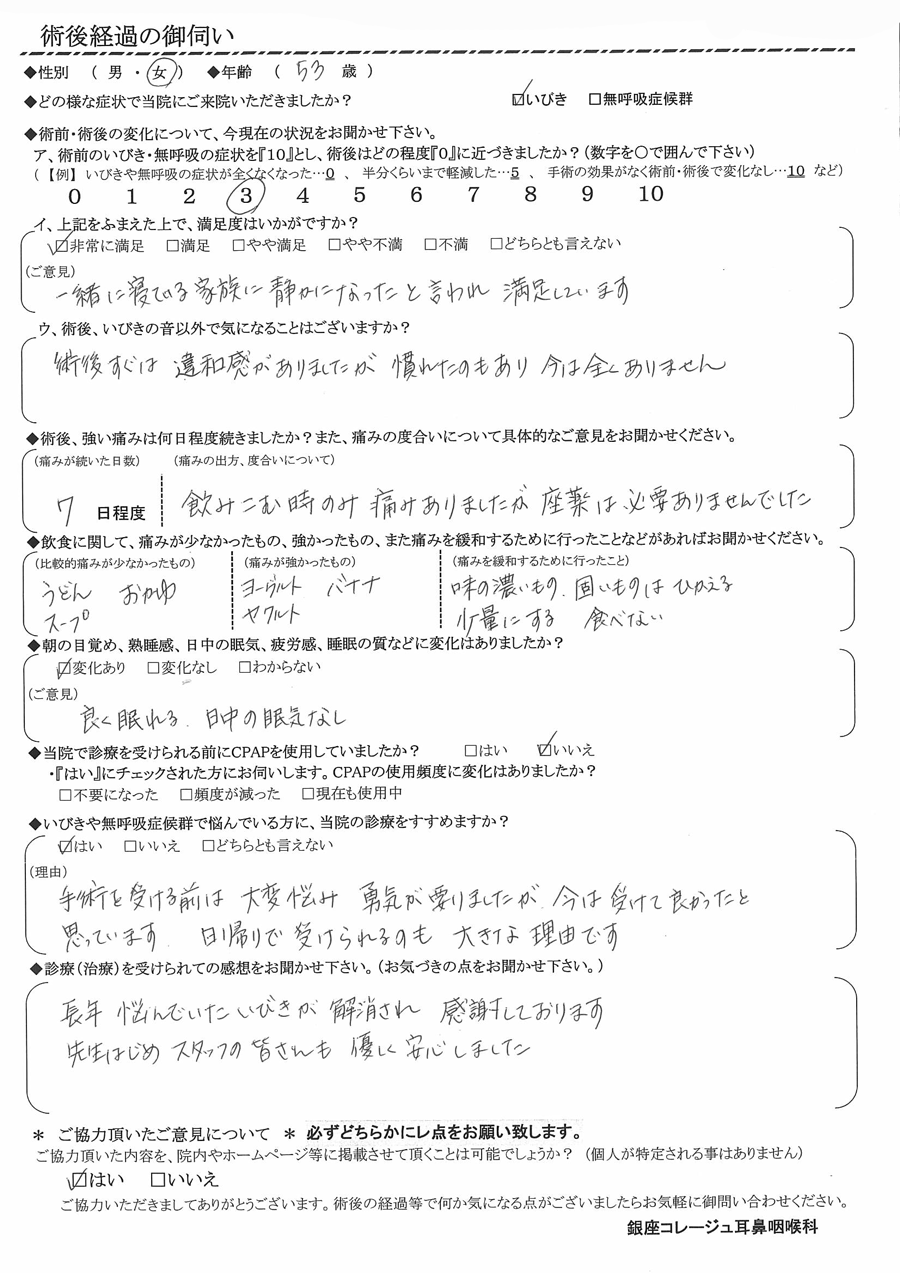 A: 長年悩んでいたいびきが解消され、感謝しております。先生はじめスッタフの皆さんも優しく安心しました。