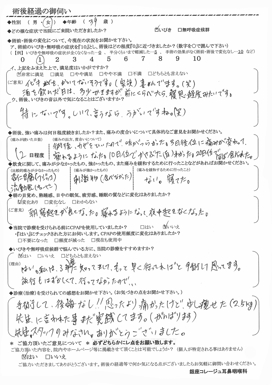 A: 手術して、後悔なし!!思ったより痛かったけど、少し痩せた(2.5㎏)。先生に言われたことまだ実践してます。(がんばります)先生、スッタフの皆さん、ありがとうございました。
