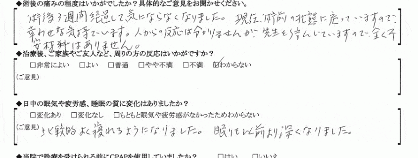 A:自分の人生の中で一番の悩みがいびきでした。外見ではわからないのとはずかしくて相談出来ないし病院に行くものではないと思っていたので私の人生はもっと早く手術をしていたらと思うと長い時間もったいないと思います。今悩んでる人は手術した方が前向きな人生がおくれると思います。スタッフの方々が皆親切でやさしくてとても安心できたすかりました。ありがとうございました。