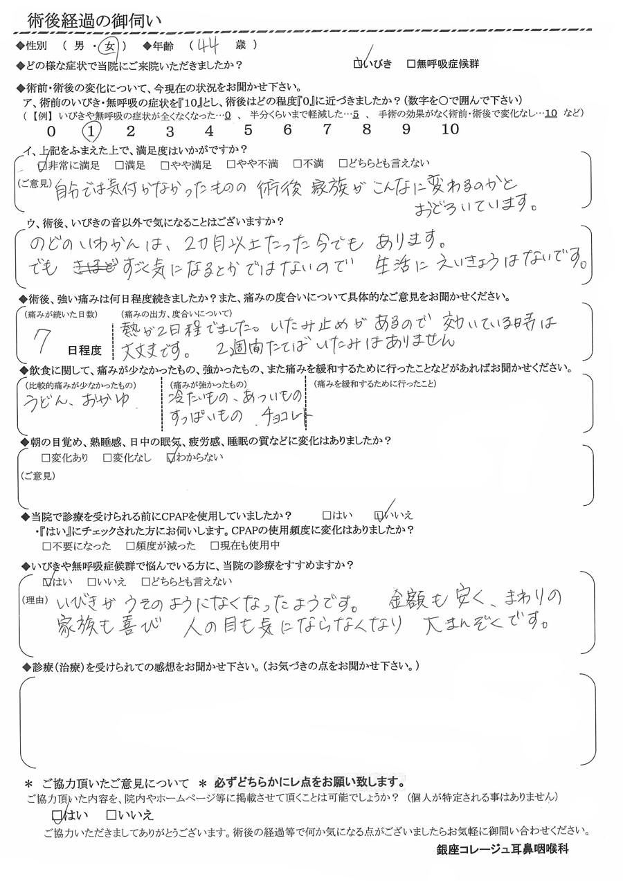 (理由) いびきが嘘のように無くなったようです。金額も安く、周りの家族も喜び、人の目も気にならなくなり大満足です。