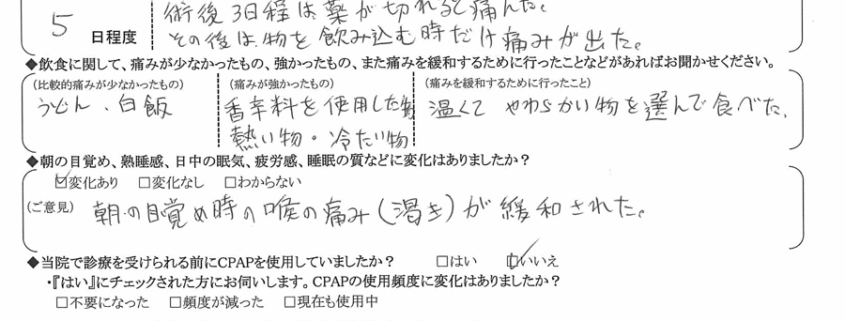 (痛みの程度について) 術後3日程は薬が切れると痛んだ。その後は物を飲み込む時だけ痛みが出た。