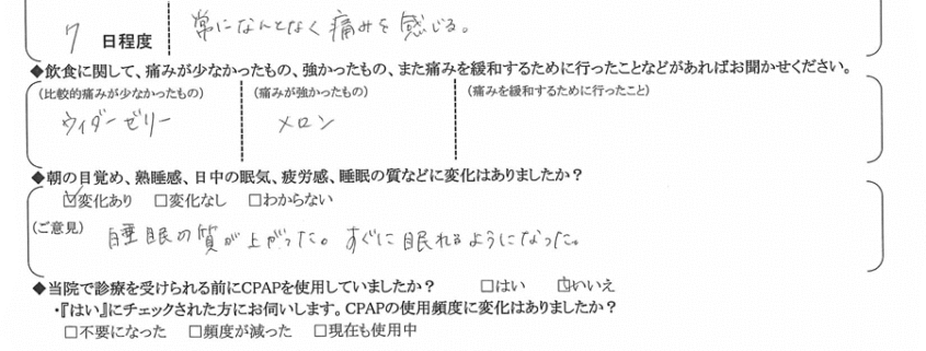 (ご意見) いびきをかいている自覚がないため実感できないが、家族はなくなったと言っている。