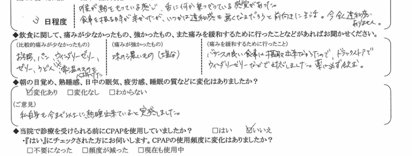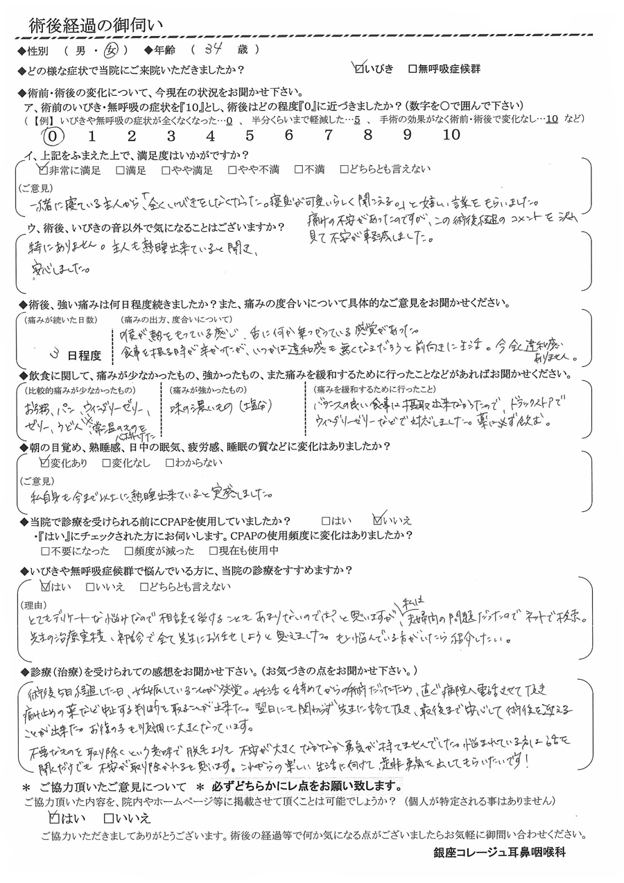 (ご意見) 一緒に寝ている主人から「全くイビキをしなくなった。寝息が可愛らしく聞こえる。」と嬉しい言葉をもらいました。痛みの不安があったのですが、この術後経過のコメントを沢山見て不安が軽減しました。