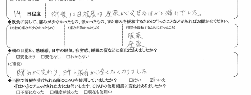 Q.術後、強い痛みは何日程度続きましたか?また、痛みの度合いについて具体的なご意見をお聞かせください。