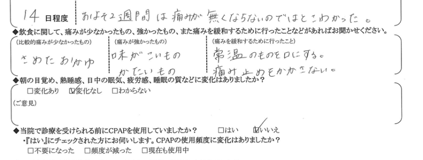 A:(痛みを緩和するために行ったこと) 常温のものを口にする。痛み止めをかかさない。