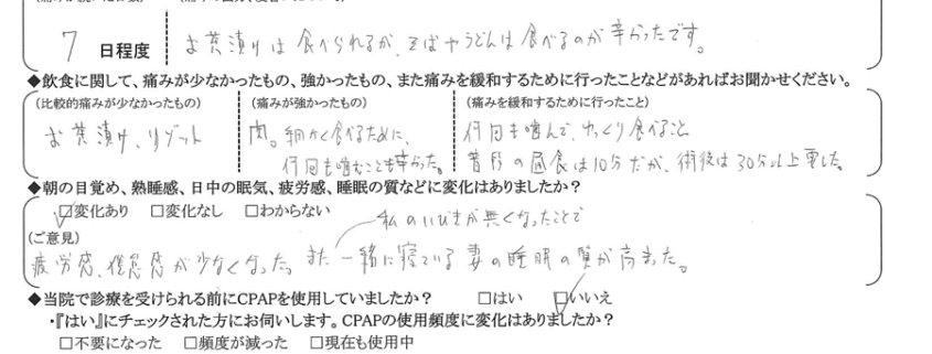 (ご意見) 疲労感、倦怠感が少なくなった。また私のいびきが無くなったことで一緒に寝ている妻の睡眠の質が高まった。