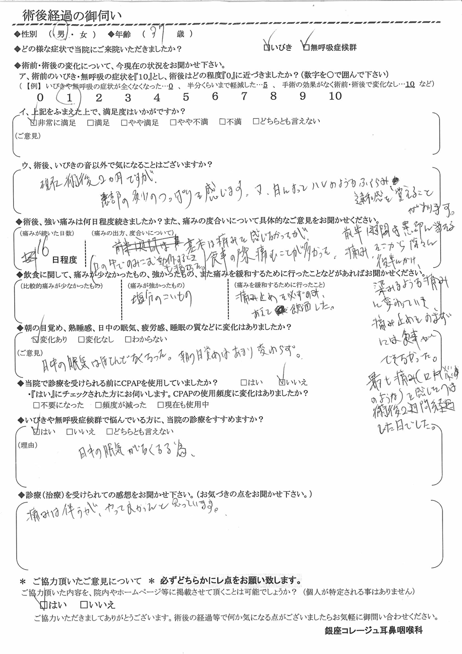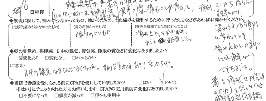 (ご意見) 日中の眠気はほとんどなくなった。朝の目覚めはあまり変わらず。