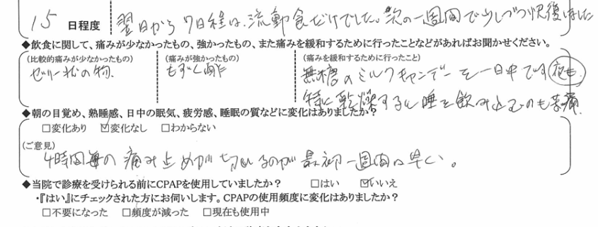 (痛みの程度について) 翌日から7日程は流動食だけでした。次の一週間で少しづつ快復しました。