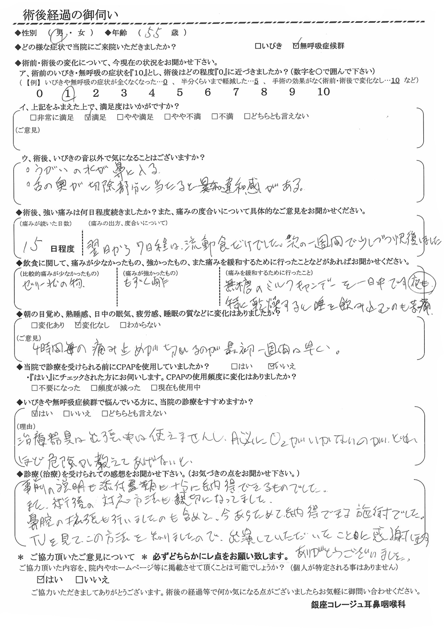 A: 事前の説明も添付書類も十分に納得できるものでした。また術後の対応方法も親切になってました。鼻腔の拡張も行いましたのも含めて、今改めて納得できる施術でした。TVを見てこの方法を知りましたので、出演して頂いたことに感謝します。ありがとうございました。