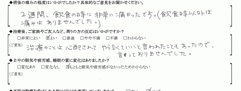 (ご意見) いびきは半減ですが、無呼吸症状は改善されたようです。(家内談) 血圧が下がりました。
