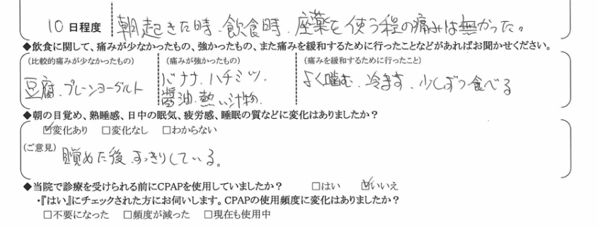 (痛みの程度について) 朝起きた時、飲食時、座薬を使う程の痛みは無かった。