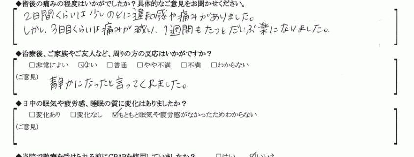 (ご意見) 自分のいびきで目が覚めることがなくなった。鼻も治療したので今後が楽しみです。