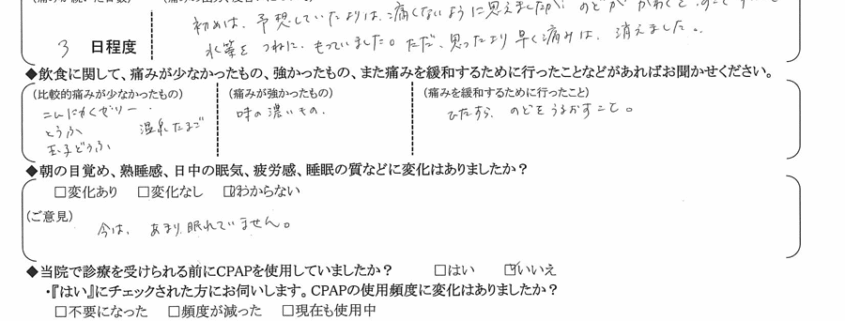 A: 無呼吸は、治ったのかなと思うので、無駄とは思いませんが、いびきが又出ているので少し残念に思います。体調は良くなったと思います。血圧は下がりました。