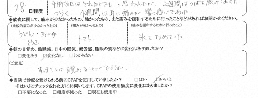 A: 手術は痛くはないが、非常に怖かった。楽にしてと言われても全く楽に出来ず、先生やスッタフの皆さんに迷惑おかけしました。鼻の手術も辛かったですが、今は快適です。2ヶ月近く経過し、録音してみましたが、時折すごく苦しそうに息を吸い込んでいる時の音が非常に大きく、姿勢によっては以前と同程度のいびきをかいているようで、別の要因も探す必要もありそうです。