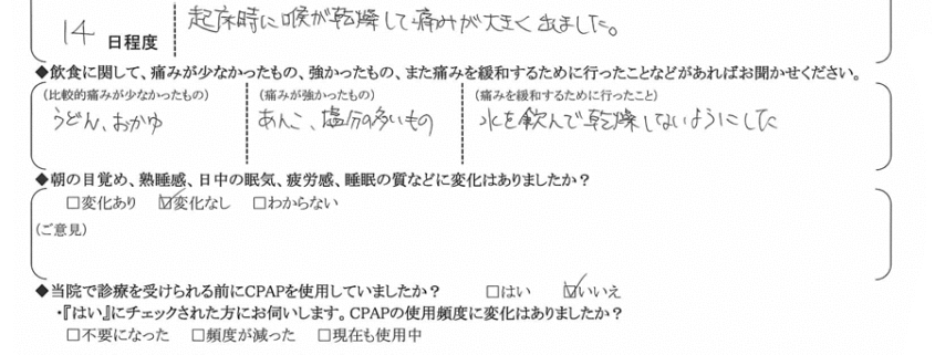 (痛みの程度について) 起床時に喉が乾燥して痛みが大きく出ました。