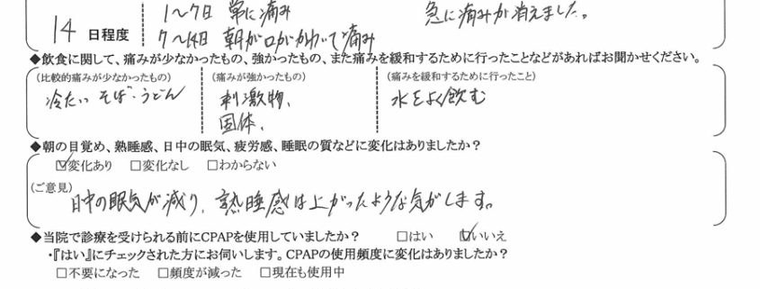 (痛みの程度について) 1~7日 常に痛み 7~14日 朝が口が渇いて痛み 急に痛みが消えました。