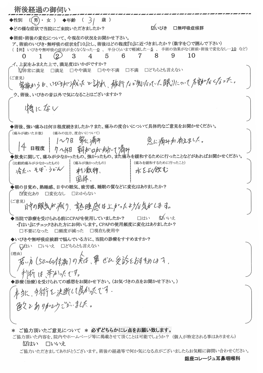 (ご意見) 家族からもいびきが減ったと言われ、旅行など気になっていた眠りについて不安がなくなった。