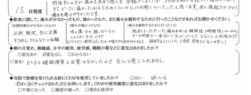 (ご意見) 術後はとても痛い思いをしたので、もう少し効果が出ることを期待していました。ただ主人によると獣のような音から普通のイビキ音になって少しボリュームダウンした気がするとの事でした。
