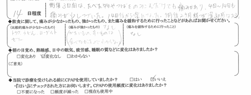 (ご意見) スマホのイビキアプリで比較したところ、術後もいびきをかいているが、音の大きさが全くちがう。(術前はゴオゴオ、術後はグーグー)