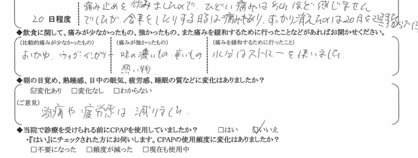 (痛みの程度について) 痛み止めを飲みましたので、ひどい痛みはそれほど感じませんでしたが、食事をしたりする時は痛みもあり、すっかり消えたのは20日を過ぎたころからでした。