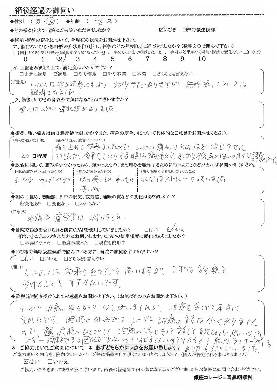 A: テレビで治療の事を知り、少し迷いましたが、治療を受けて本当に良かったです。睡眠の外来ではレーザー治療の話は全くありませんでしたので選択のひとつとして治療のことももっと話して欲しいと思いました。レーザー治療をできる医院が少ないので仕方ないのでしょうか?私はラッキーでした。ありがとうございました。