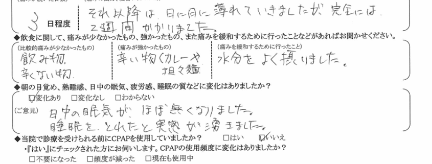 (痛みの程度について) それ以降は、日に日に薄れていきましたが、完全には2週間かかりました。