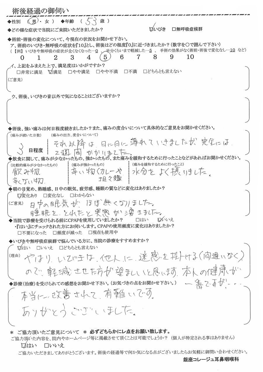 ア, 術前のいびき・無呼吸の症状を『10』だったとすると、術後はどの程度になりましたか? 【5】
