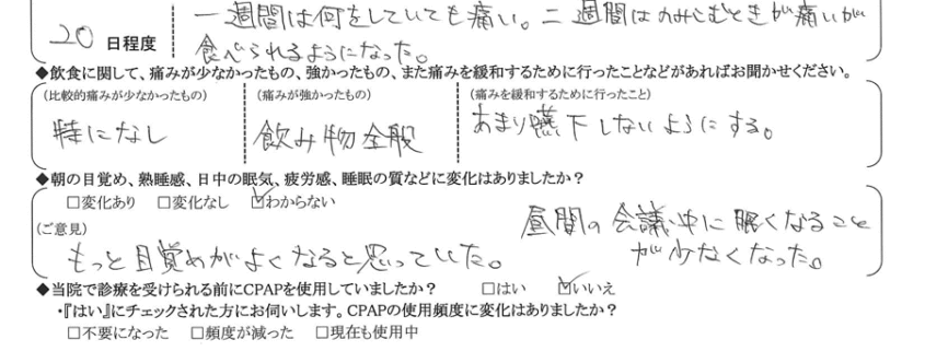 (痛みの程度について) 一週間は何をしていても痛い。二週間は飲み込む時が痛いが食べられるようになった。