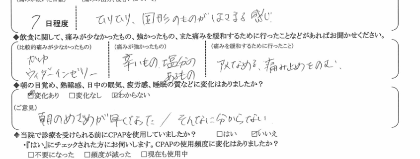 Q.術後、強い痛みは何日程度続きましたか?また、痛みの度合いについて具体的なご意見をお聞かせください。