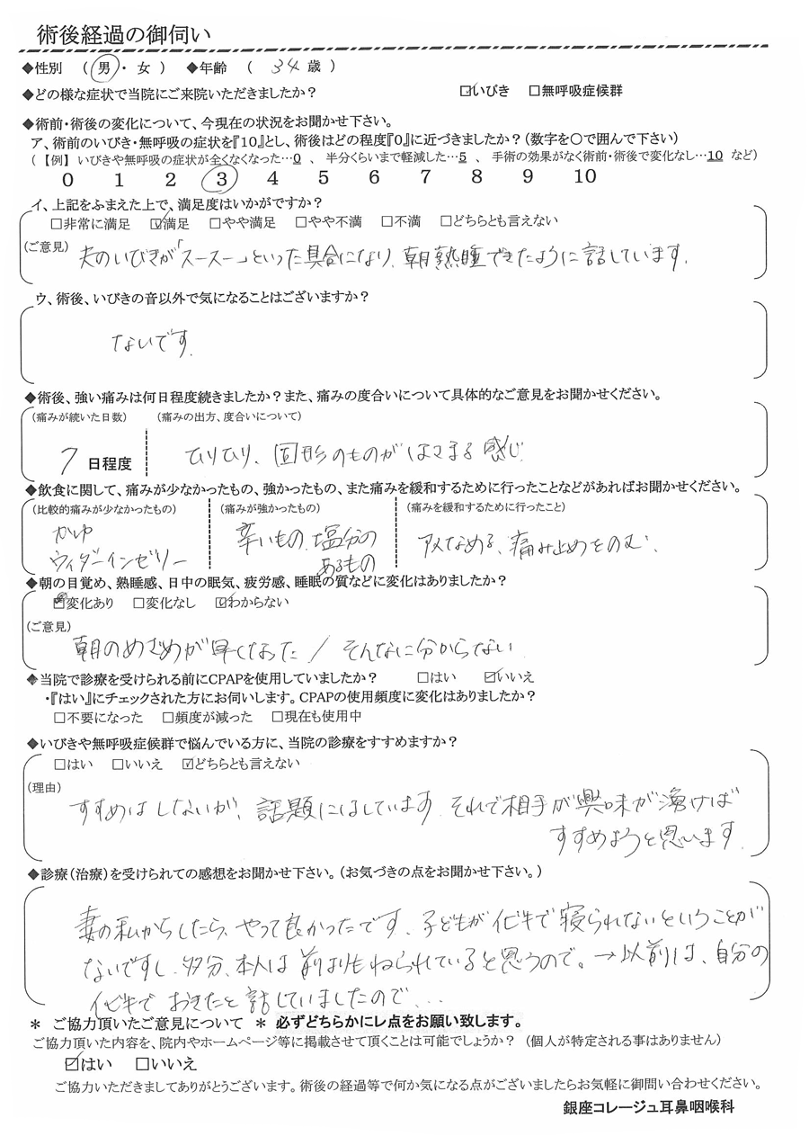 ア, 術前のいびき・無呼吸の症状を『10』だったとすると、術後はどの程度になりましたか? 【3】