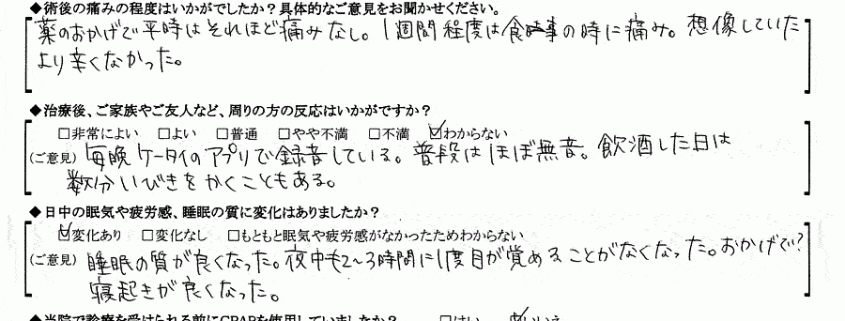 (ご意見) 自分ではいびきがなくなったのか分かりませんが、家族からはいびきかいてないと言われたので、安心して眠れます。