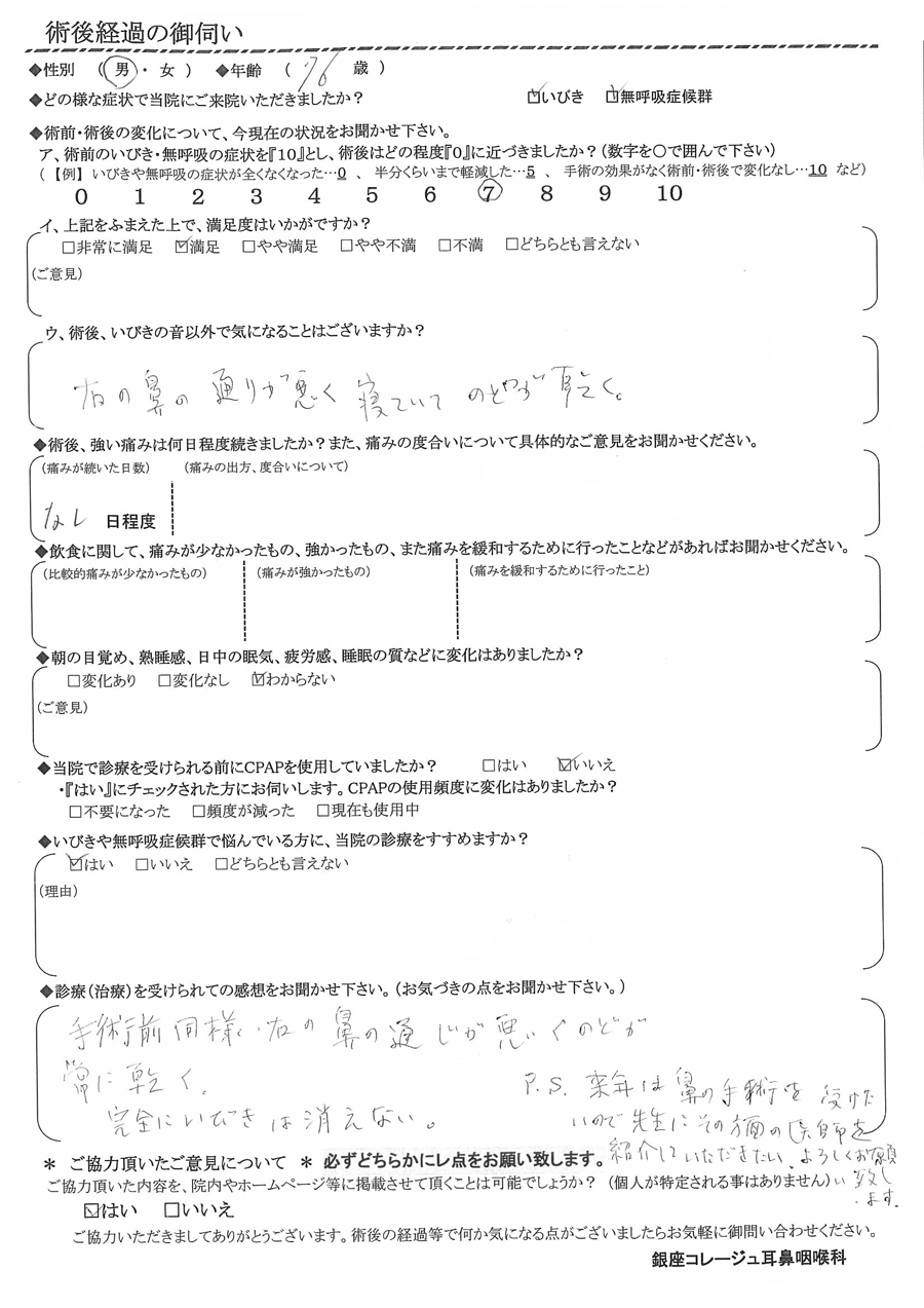 A: 手術前同様、右の鼻の通じかが悪くのどが常に渇く。完全にいびきは消えない。P.S.来年は鼻の手術を受けたいので先生にその方面の医師を紹介して頂きたい。よろしくお願い致します。