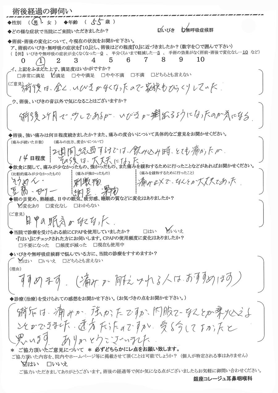 (ご意見) 術後は全くいびきがなくなったので家族もびっくりしていた。