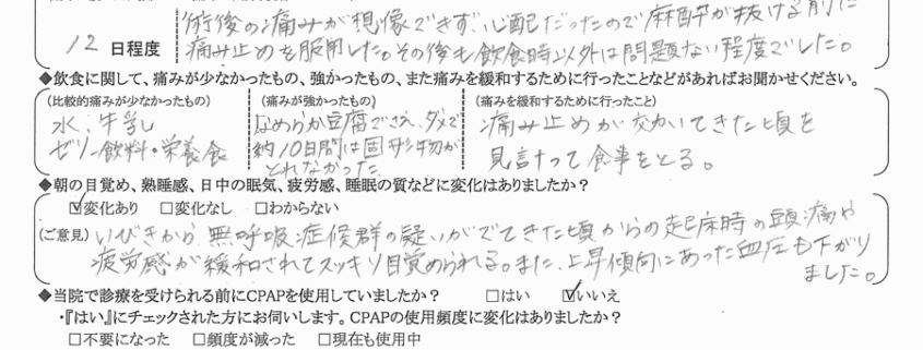 (理由) 以前に作成したマウスピースでは、無意識のうちに外してしまうこともあり、他院での検査でCPAPの使用をすすめられた時には、不安とこの先一生装着し続けなければならない絶望感でしたが、手術を受けたことで解消されました。