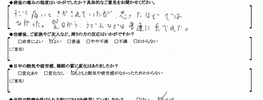 (ご意見) 以前は、日中の眠気や疲労感は、かなりありました。現在、それは全くありません。