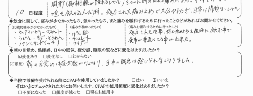 (ご意見) 朝の目覚めは疲労感がなくなり、日中の眠気は感じられなくなりました。