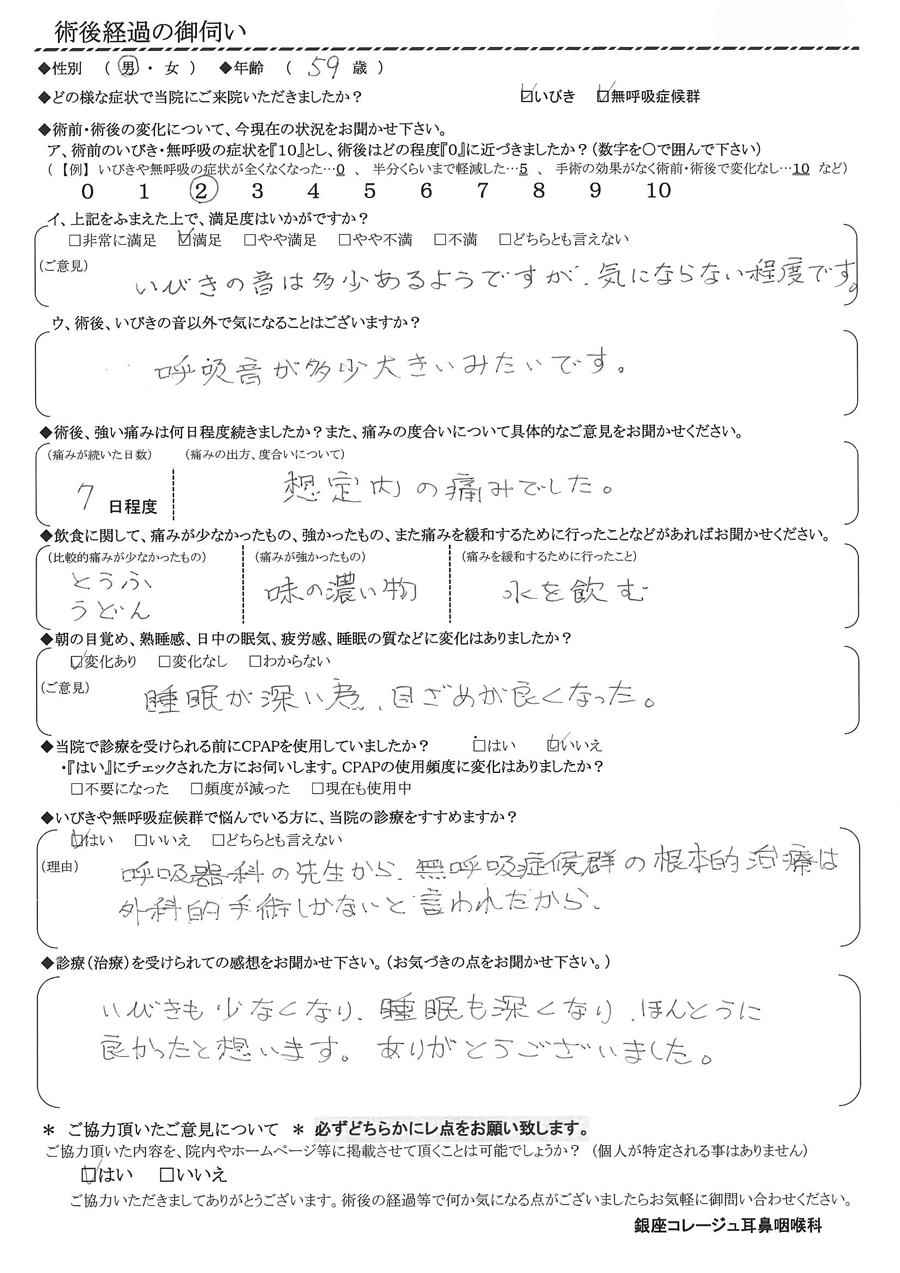 A: いびきも少なくなり、睡眠も深くなり、本当に良かったと思います。ありがとうございました。