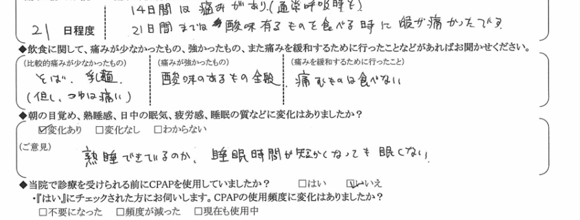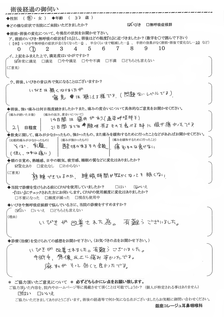 (理由)   いびきが改善された為。有難うございました。