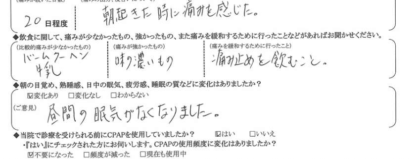 A: 患者さんの意見も見れますし、自分で決める事です。CPAP着用のストレスから解放されました。