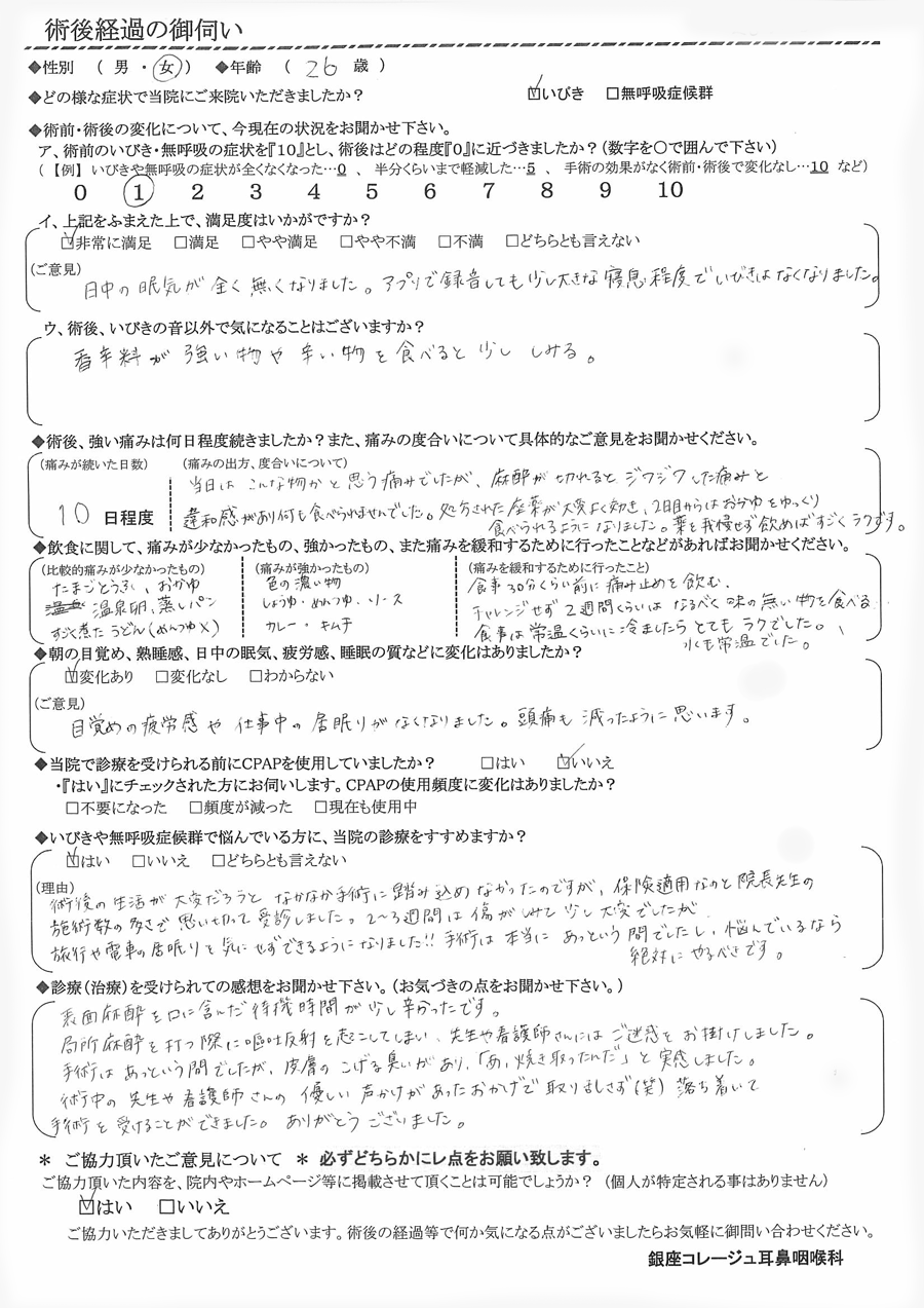 (理由)   術後の生活が大変だろうとなかなか手術に踏み込めなかったのですが、保険適用なのと院長先生の施術数の多さで思い切って受診しました。2~3週間は傷がしみて少し大変でしたが、旅行や電車の居眠りを気にせずできるようになりました!!手術は本当にあっという間でしたし、悩んでいるなら絶対にやるべきです。