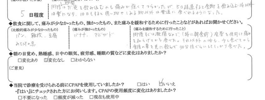 (痛みの程度について) 術後3日間は唾液を飲み込むのも痛みが強くて辛かったが、5日経過すると食べ物を飲み込む時以外は楽になり、10日もすると固い物やしみる物以外は普通に食べれるようになった。
