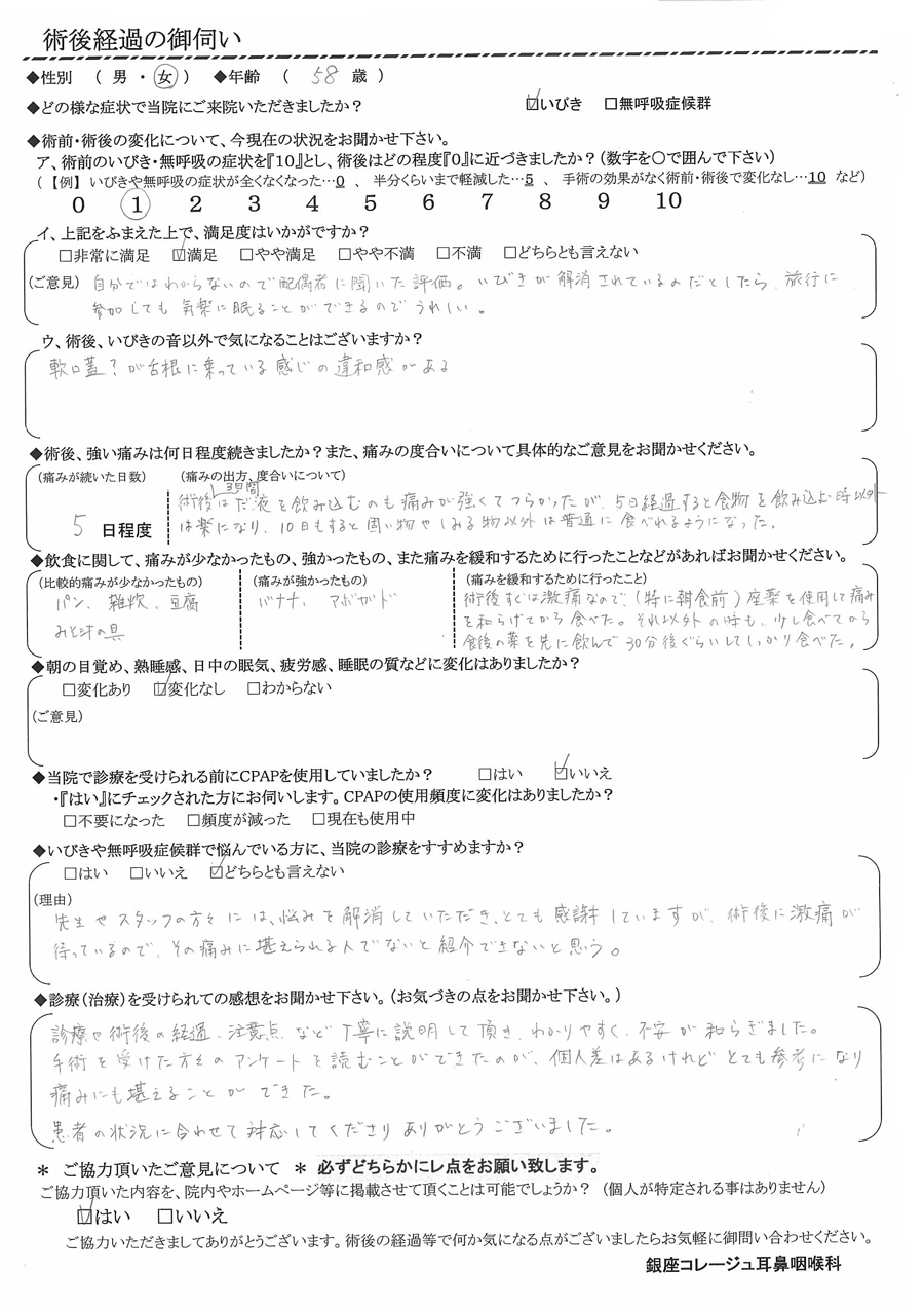 (ご意見) 自分ではわからないので配偶者に聞いた評価。いびきが解消されているのだとしたら、旅行に参加しても気楽に眠ることができるので嬉しい。
