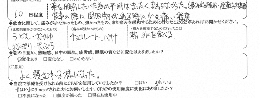(痛みの程度について) 薬を服用していた為か平時は全く変わらなかった。(痛み止め服用、座薬は未使用)食事の際に固形物が通る時に少々痛い程度。