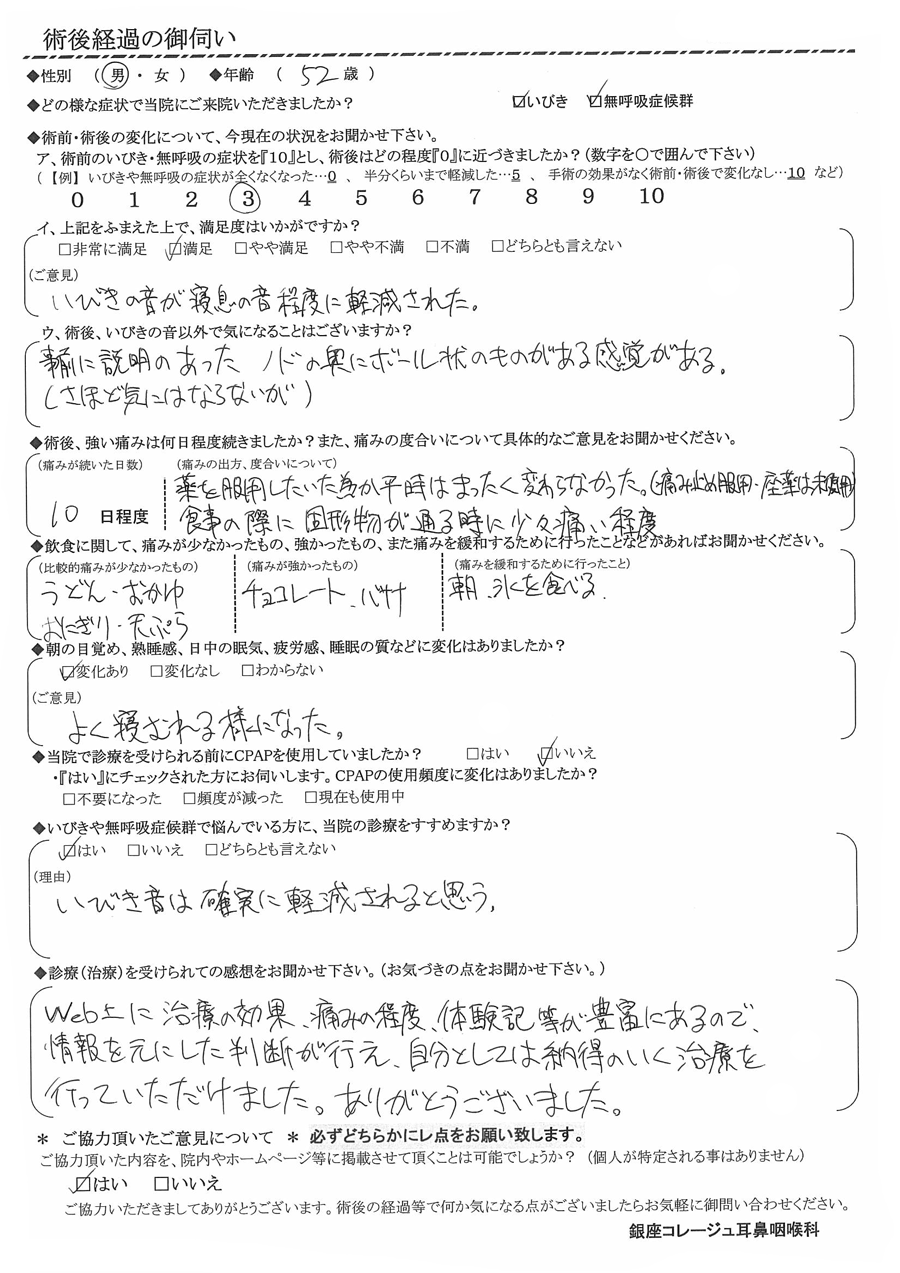 (ご意見) いびきの音が寝息の音程度に軽減された。