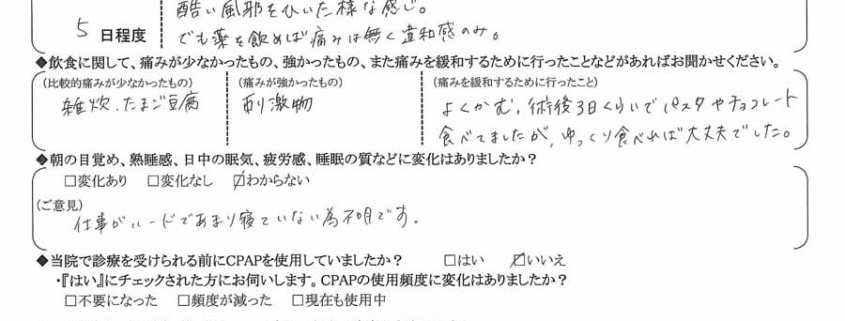 A:(痛みを緩和するために行ったこと) よく噛む、術後3日位でパスタやチョコレート食べていましたが、ゆっくり食べれば大丈夫でした。
