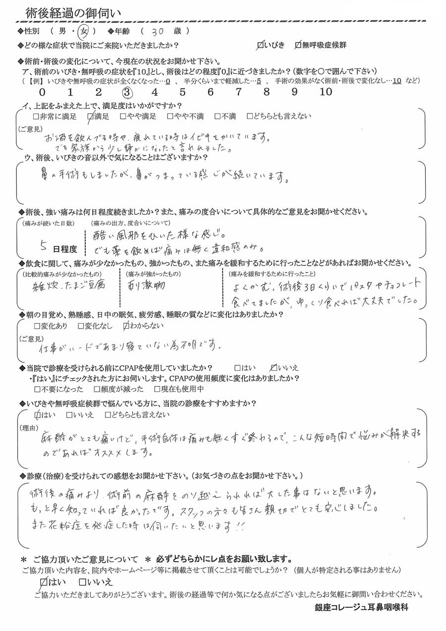 ア, 術前のいびき・無呼吸の症状を『10』だったとすると、術後はどの程度になりましたか? 【3】