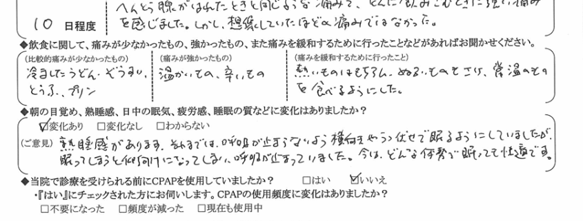 (ご意見) 熟睡感があります。それまでは呼吸が止まらないよう横向きやうつ伏せで眠るようにしていましたが、眠ってしまうと仰向けになってしまい、呼吸が止まっていました。今はどんな体勢で眠っても快適です。